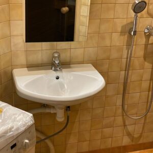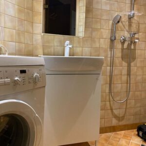 Muutsime vannitoa märgatavalt ilusamaks ja praktilisemaks uue valamukapi paigaldausega. Korrastasime ka valamu veeühendusi.